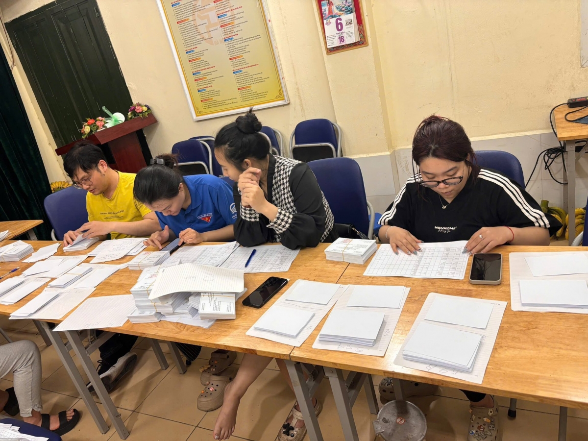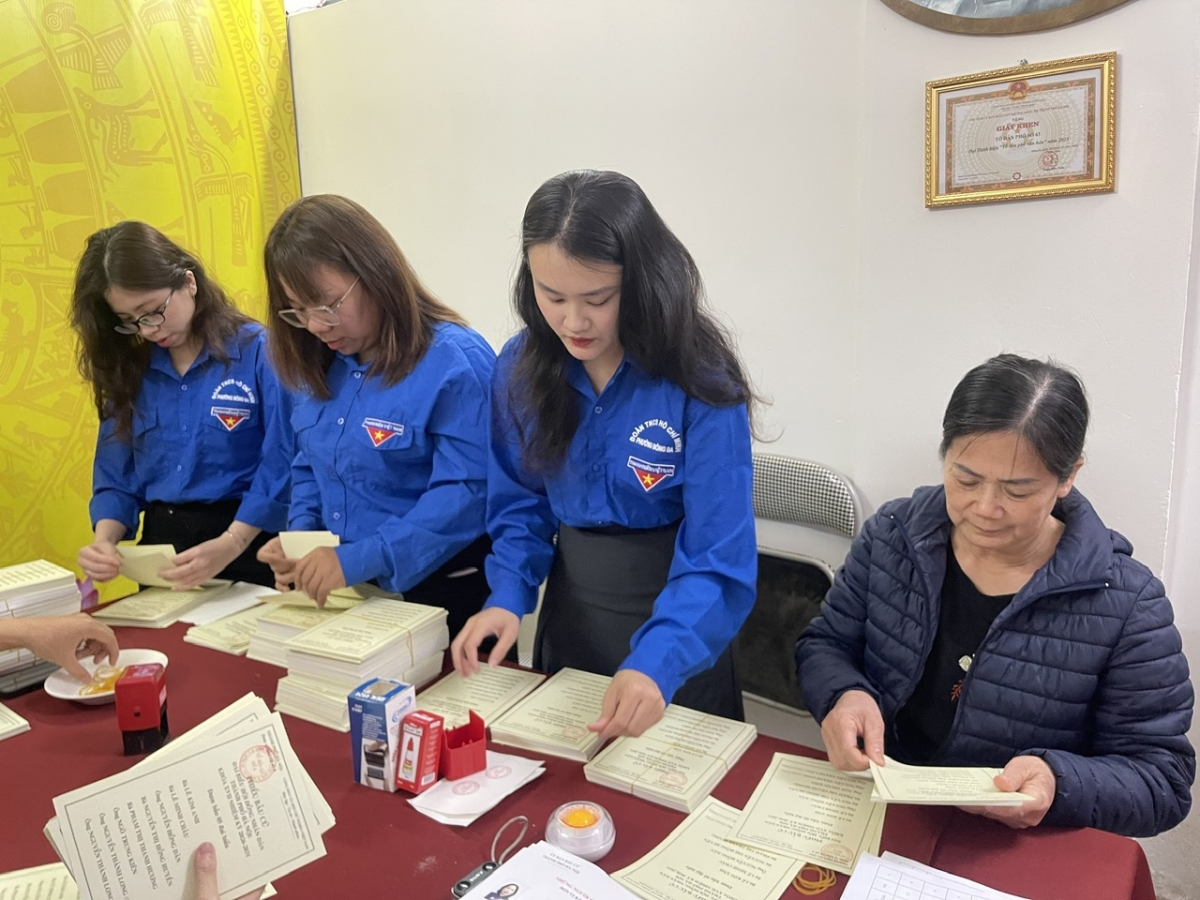 Tại các khu dân cư của phường Đống Đa, không chỉ hỗ trợ khâu chuẩn bị, nhiều đoàn viên còn tham gia cùng tổ bầu cử đóng dấu thẻ cử tri, kiểm tra danh sách, phân loại và sắp xếp thẻ để phát cho người dân. Với sự cẩn thận và tinh thần trách nhiệm cao, từng tấm thẻ cử tri được chuẩn bị chu đáo, tránh sai sót, nhầm lẫn.