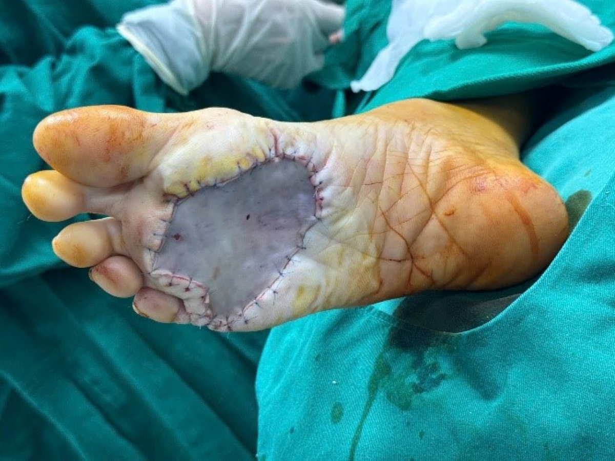 Qua thăm khám, các bác sĩ đã chẩn đoán bệnh nhân bị ung thư tế bào hắc tố vùng gan chân phải. Bệnh nhân nhanh chóng được tiến hành phẫu thuật cắt bỏ hoàn toàn tổn thương ung thư, ghép da tạo hình tổn khuyết. Hiện tại tình trạng bệnh nhân ổn định.