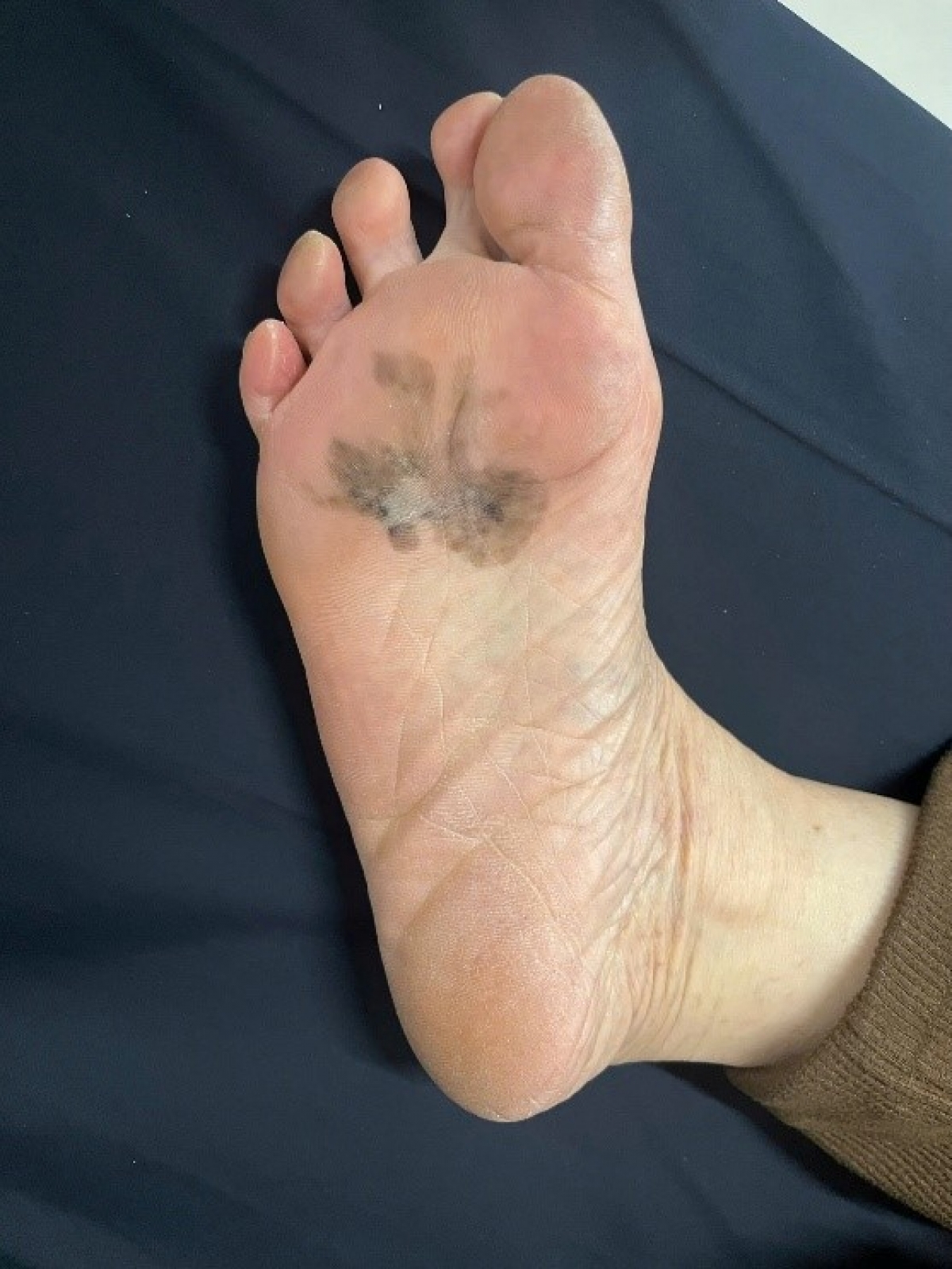 Bệnh nhân nữ 70 tuổi xuất hiện một tổn thương tăng sắc tố màu đen ở vùng gan bàn chân phải cách đây khoảng 15 năm. Trong suốt nhiều năm, tổn thương không gây đau, không ngứa, không ảnh hưởng gì tới sinh hoạt hàng ngày và chỉ tăng kích thước chậm nên người bệnh không đi khám. Khoảng một năm gần đây, bệnh nhân nhận thấy vùng da màu đen này lớn nhanh hơn và lan rộng ra xung quanh, nhưng hoàn toàn không đau, không ngứa, không loét. Sau khi tình cờ đọc được thông tin về bệnh ung thư hắc tố trên báo chí, bệnh nhân đã chủ động đến bệnh viện Da liễu Trung ương để kiểm tra.
